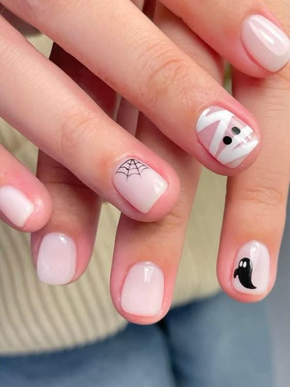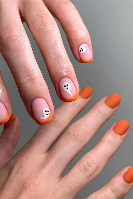 For clients wanting a pop of colour, suggest orange Halloween nails with mini spider webs or purple Halloween nails adorned with tiny skulls. And don’t overlook the classic combo of black and white Halloween nails—they're timeless, spooky, and perfect for short nail designs. The trick here is to focus on clean lines and a single accent nail for a sleek, modern vibe.