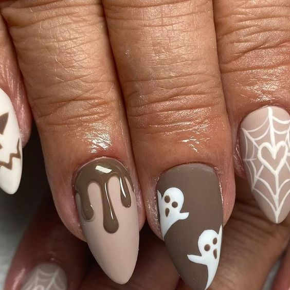 Encourage clients who want a bold statement to go for a full Halloween acrylic nails set, where each nail has its own unique design—pumpkins, bats, and webs all coming together to create a spooky masterpiece.