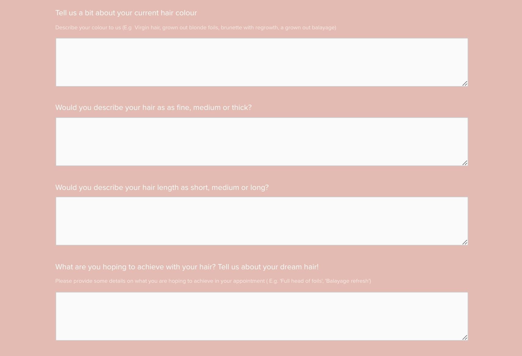You can also add a pre-consultation form (can be created in under 10 mins using Google form) that can then be added to your booking page. If you have tech support available it can also be embedded on your salon website design.