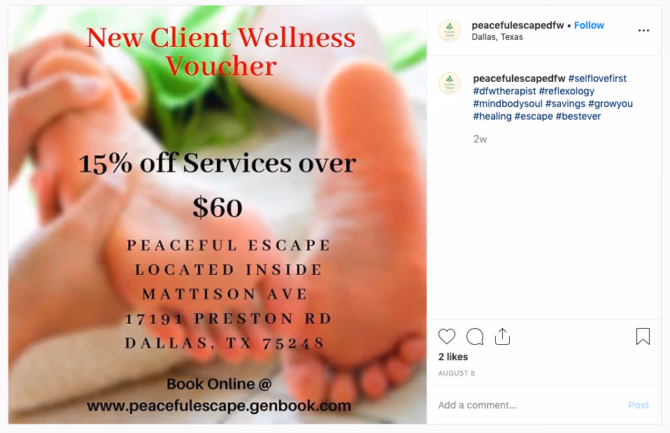You can see this tip in action over at Peaceful Escape, a spa in Dallas, Texas. The company offers a “New Client Wellness” voucher which gives new customers 15% off their purchase over $60.