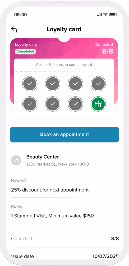 Nope! It’s all built-in to your Booksy account— no extra costs, no extra apps. Just switch it on. Your clients can also keep track of their cards and stamps right in the same place they book and manage their appointments - in the Booksy for Customers app. No extra apps, logins, or fees for you or your clients.