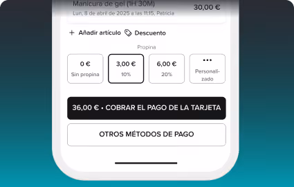 Sistema TPV integrado que te permite cobrar, gestionar y registrar todos los pagos desde la app.