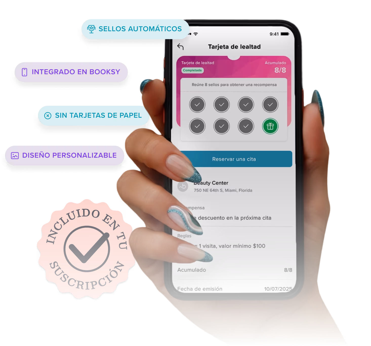 ¡Claro que no! Todo está integrado en tu cuenta de Booksy, sin costos extra ni apps adicionales. Solo actívalo. Tus clientes también pueden llevar el control de sus tarjetas y sellos directamente desde la app de Booksy para clientes, donde ya reservan y gestionan sus citas. Sin apps, inicios de sesión o cargos adicionales para ti ni para tus clientes.