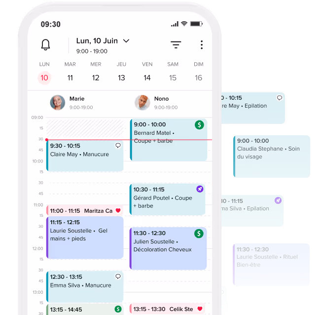 Les icônes sur les réservations vous permettent de voir rapidement les détails des rendez-vous. Cliquez sur l'icône pour modifier facilement le rendez-vous, consulter la fiche client ou finaliser le paiement.