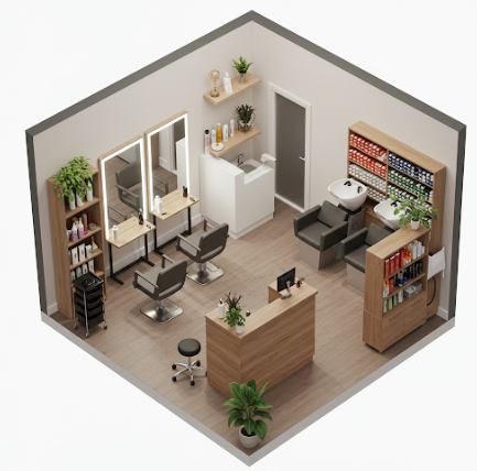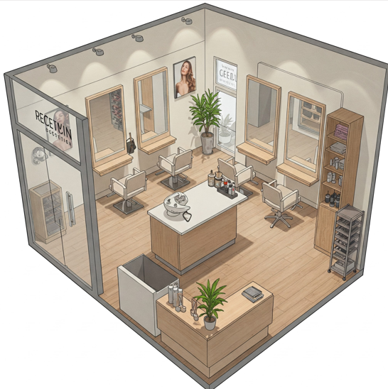 Nawet w małym salonie musisz wygospodarować miejsce na stanowiska fryzjerskie, myjki, recepcję z poczekalnią, strefę koloryzacji, toaletę oraz ewentualne zaplecze na przechowywanie produktów i narzędzi.